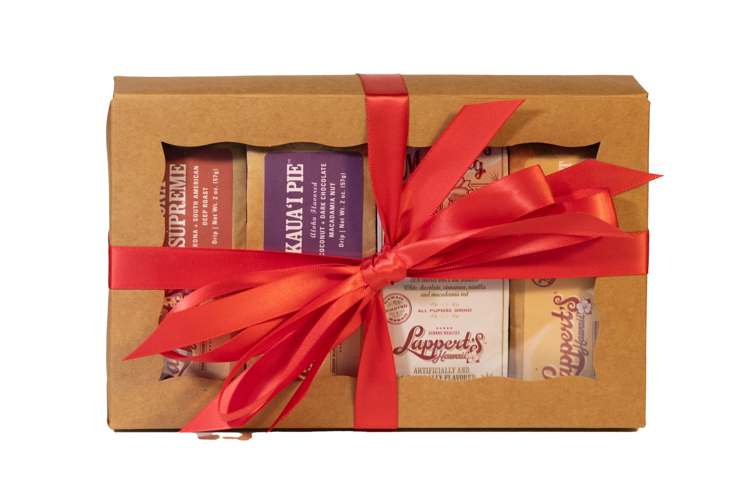 Enjoy four 2oz coffee bags in one gift box! Featuring Kauai Pie, Kona Supreme, Vanilla Macadamia Nut, and our seasonal favorite, Christmas Morning Magic. Whether you're gifting the coffee lover in your life or simply want to sample a variety of our signature blends, this set is the perfect choice.
