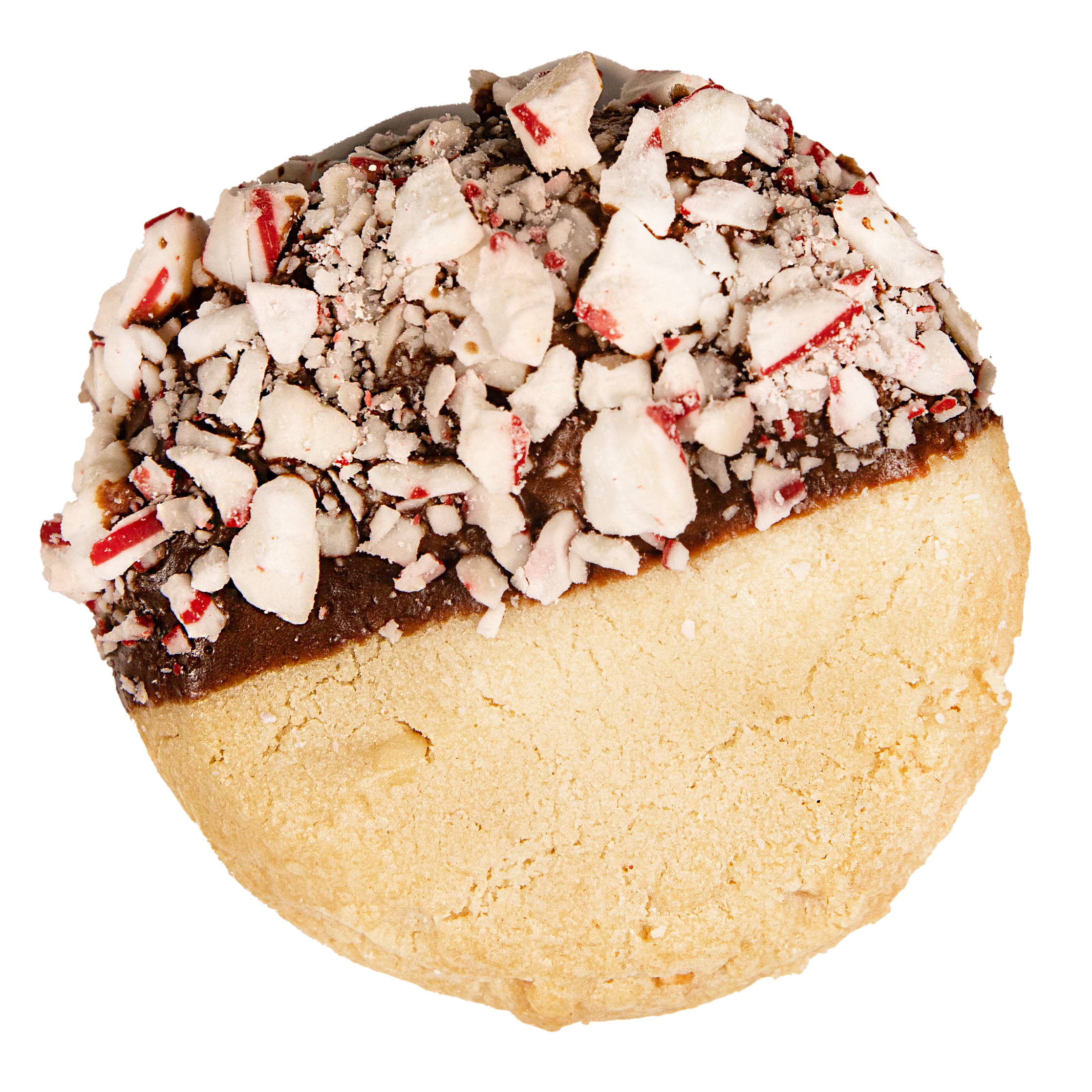 Our Macadamia Nut Shortbread cookie, dipped in rich chocolate and sprinkled with peppermint crumble—pure holiday joy in every bite!