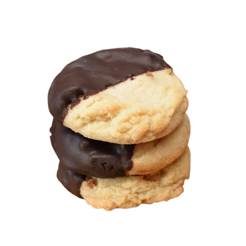 Golden, buttery shortbread packed with crunchy macadamia nuts and dipped in semi-sweet dark chocolate.